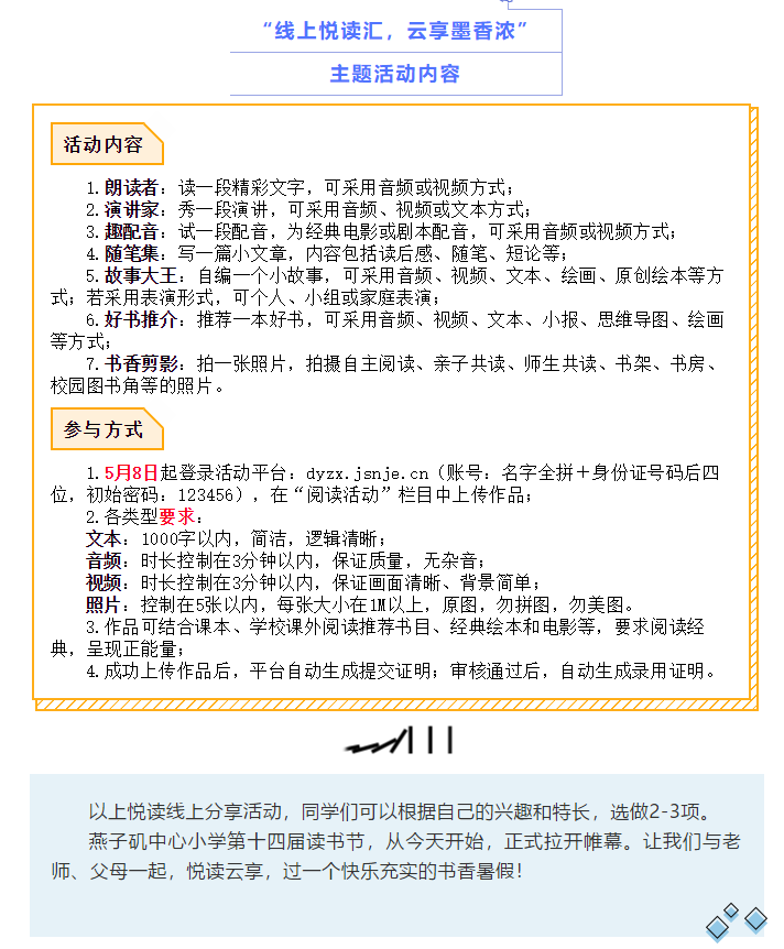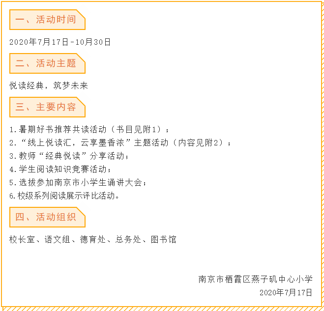 为认真贯彻落实好立德树人根本任务,促使我校师生养成良好的阅读习惯,提高师生思想道德修养和科学文化素养,推进“书香校园”建设,经研究,决定开展2020年燕子矶中心小学第十四届师生“读书节”活动。活动方案如下: