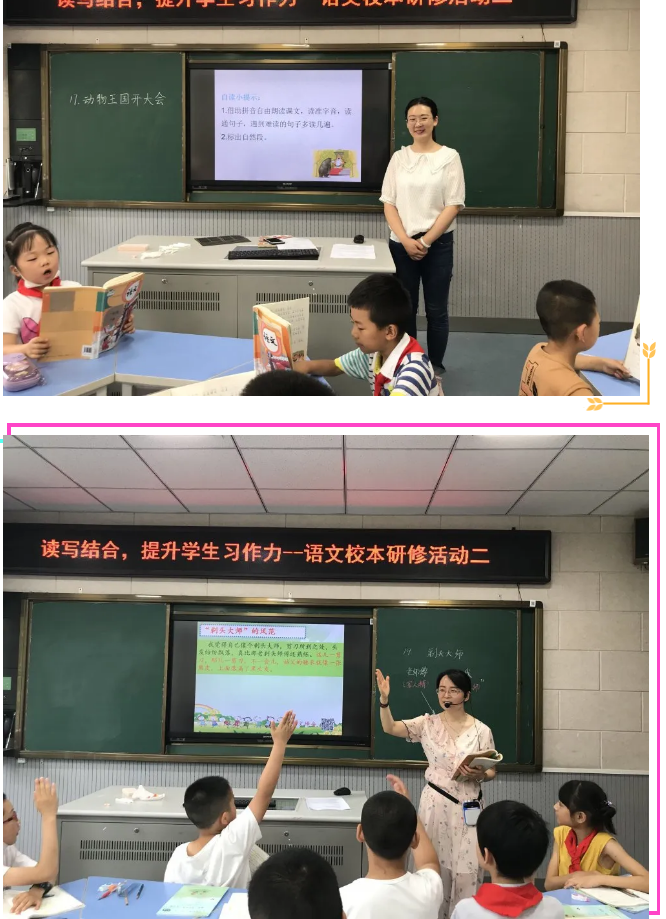 6月10日,语文教研组开展了本学期第二次校本研修活动。本次活动由曹静组长主持,全体语文老师参与,共分为两个部分。 阚书老师在校录播教室为大家带来了一年级《动物王国开大会》一课,阚老师的课堂教学活动具有趣味性,语言生动活泼,符合低年段学生的学习特点。在进行生字教学时,阚老师将随文识字与集中识字相结合,有效地提高了识字效率。写字教学扎实,通过小口令调动孩子的学习兴趣,边范写边提示重点笔画。最后设计狗熊四次通知内容的对比,让孩子明白通知的“四要素”并填写书后习题,学以致用。 第二节由张玉萍老师执教三年级《剃头大师》一课,通过一首轻松愉快的歌曲——《你笑起来真好看》,拉近了师生之间的距离。这节课,张老师充分发挥学生的自主学习能力,在词语教学时,因学生已上过本课的网络课,张老师放开手,让学生自由地提问并带入课文句子中解释词语意思。张老师通过一个个问题将全篇课文巧妙地串联在一起,带着学生回顾了文中老师傅和“我”各是怎样给小沙剃头的以及小沙对两位的评价,最后联系生活实际,写一写平时剃头的有趣过程,层层递进,丰富了学生的情感体验。 下午4点,各位语文老师齐聚录播教室,开展教研组研讨。曹静组长充分肯定了两位上课老师的教研课,并对今天的教案检查进行反馈,提醒各位老师教案需要完善的地方:教案内容依次是:封面、年段课程标准、学期教学计划,本册教材分析,单元教材分析、每课教案。授课日期不按课时算,按实际上课写。已经上过的课文,都要有教后记。口语交际可以和语文园地合并写,需把提前把格式设计好。一定要有读写结合点设计和最后的作业设计,作业设计要减负增效,尽量体现出多样性、分层性和探究性。 本次语文教研活动收获颇多,扎实有效的学科教研是学校教学的生命线,而规范教案设计为今后的教师备课起到“指明灯”的作用,如何“找准读写训练点”促进学生习作能力将一直伴随着我们每一堂课,且“教”且探索,且“学”且摸索。