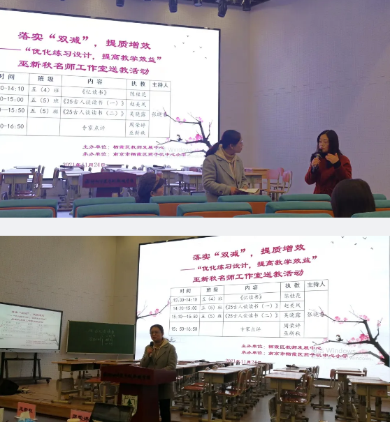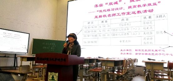教学展示结束后,省特级老师巫新秋校长和区教师发展中心周荣婷主任分别进行了点评指导。巫特首先对三位上课老师的教学呈现表示了充分肯定,传递了落实“双减”、提质增效的教研目标,并就两节送教课的课堂设计侧重点与延伸点,尤其对古文代词的灵活理解、长句的读准读懂,进行了解读。