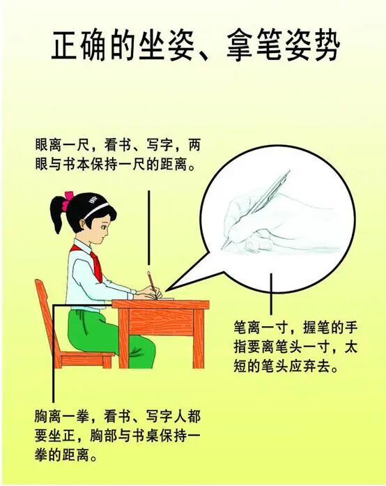 在家中学习时要保持“三个一”的正确姿势,即眼睛离书本一尺,胸口离桌沿一拳,握笔的手指离笔尖一寸,读写连续用眼时间不宜超过40分钟。