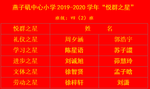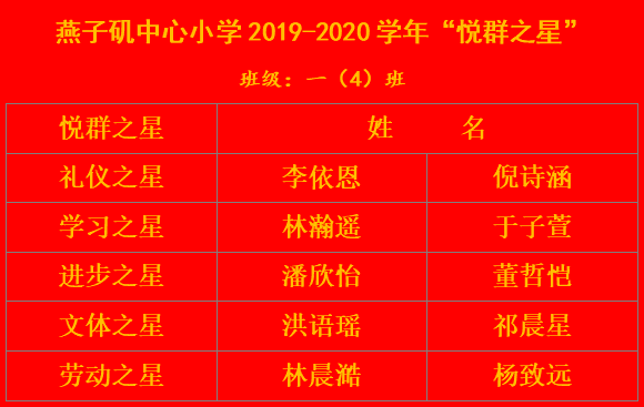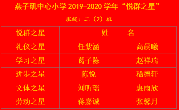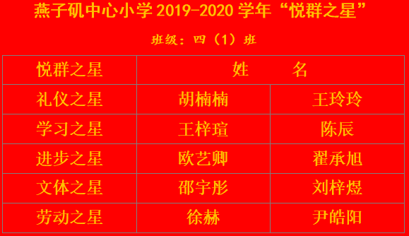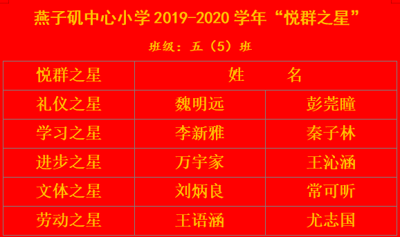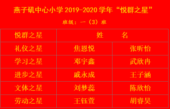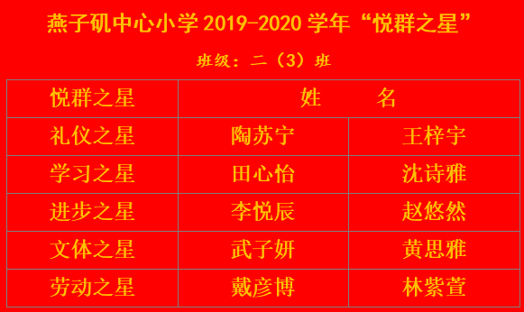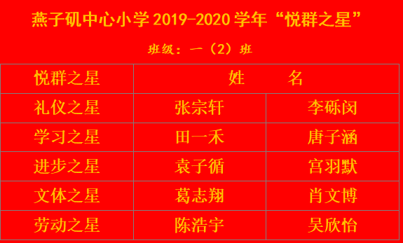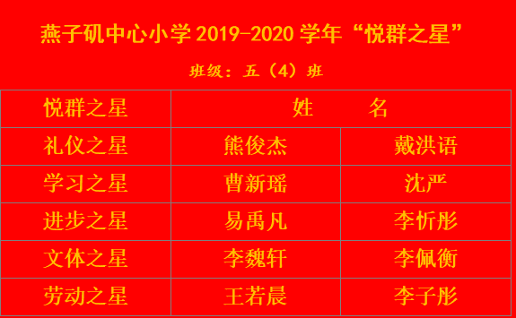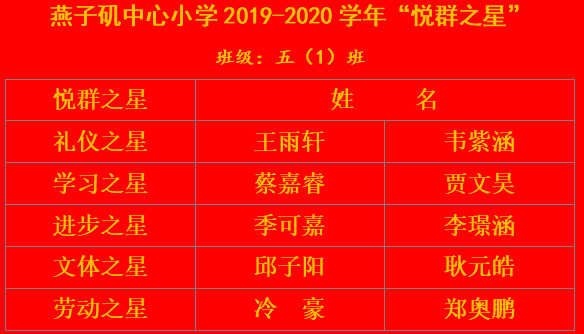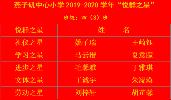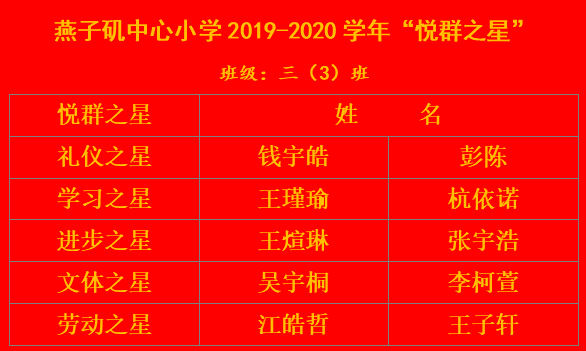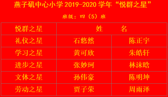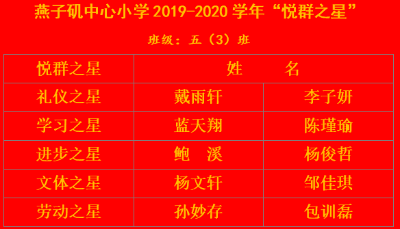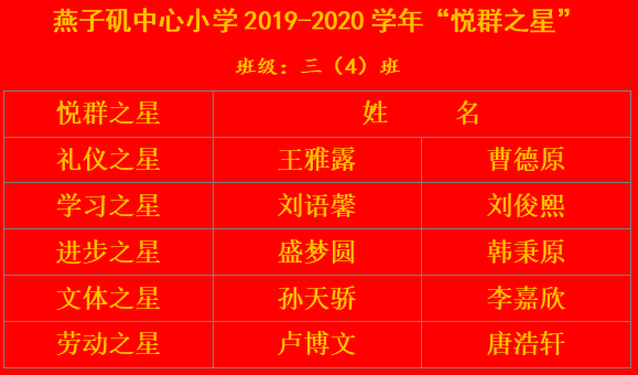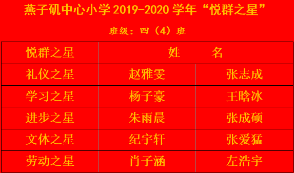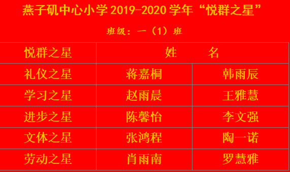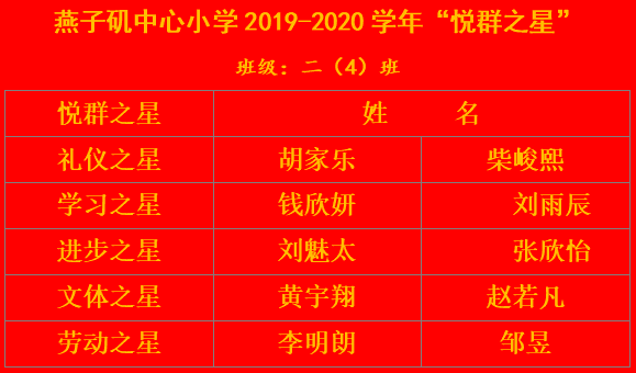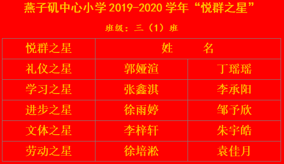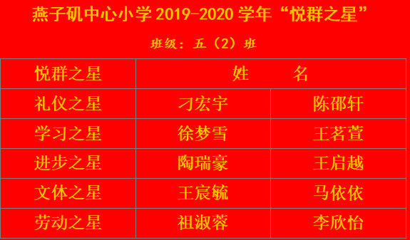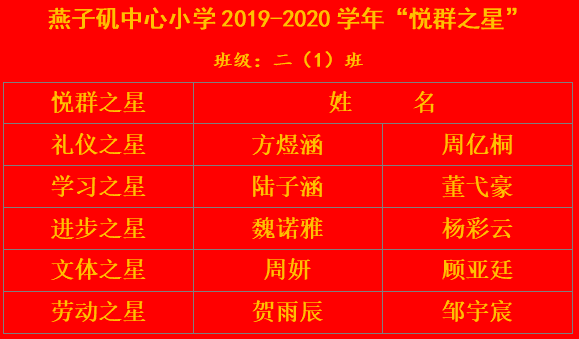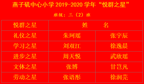 经过一个学期的努力,以下同学在2019-2020学年第二学期中,表现优秀,被授予燕子矶中心小学“悦群之星”荣誉称号。