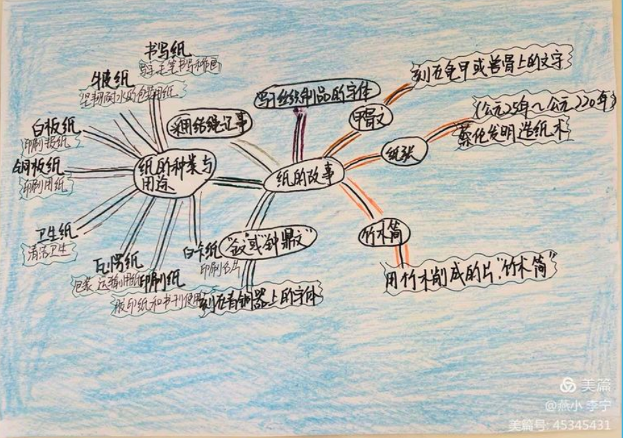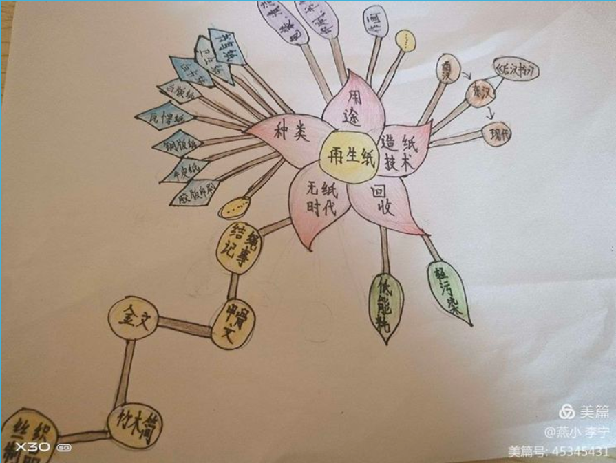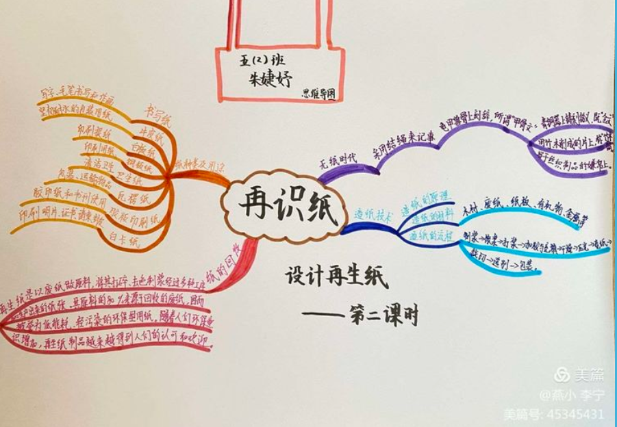 我校高年级同学以视频学习的方式每周一次推出了一个活动,形成系列活动——设计再生纸,孩子们由初识纸,到再次认识纸,到后面的学习制作再生纸,思考提升,逐步推进。同学们了解纸的知识,学习思维导图的做法,自己绘制关于纸的思维导图,亲手制作设计再生纸,同学们兴致盎然,收到了非常多的作品,涌现出了一批优秀作业及作品。