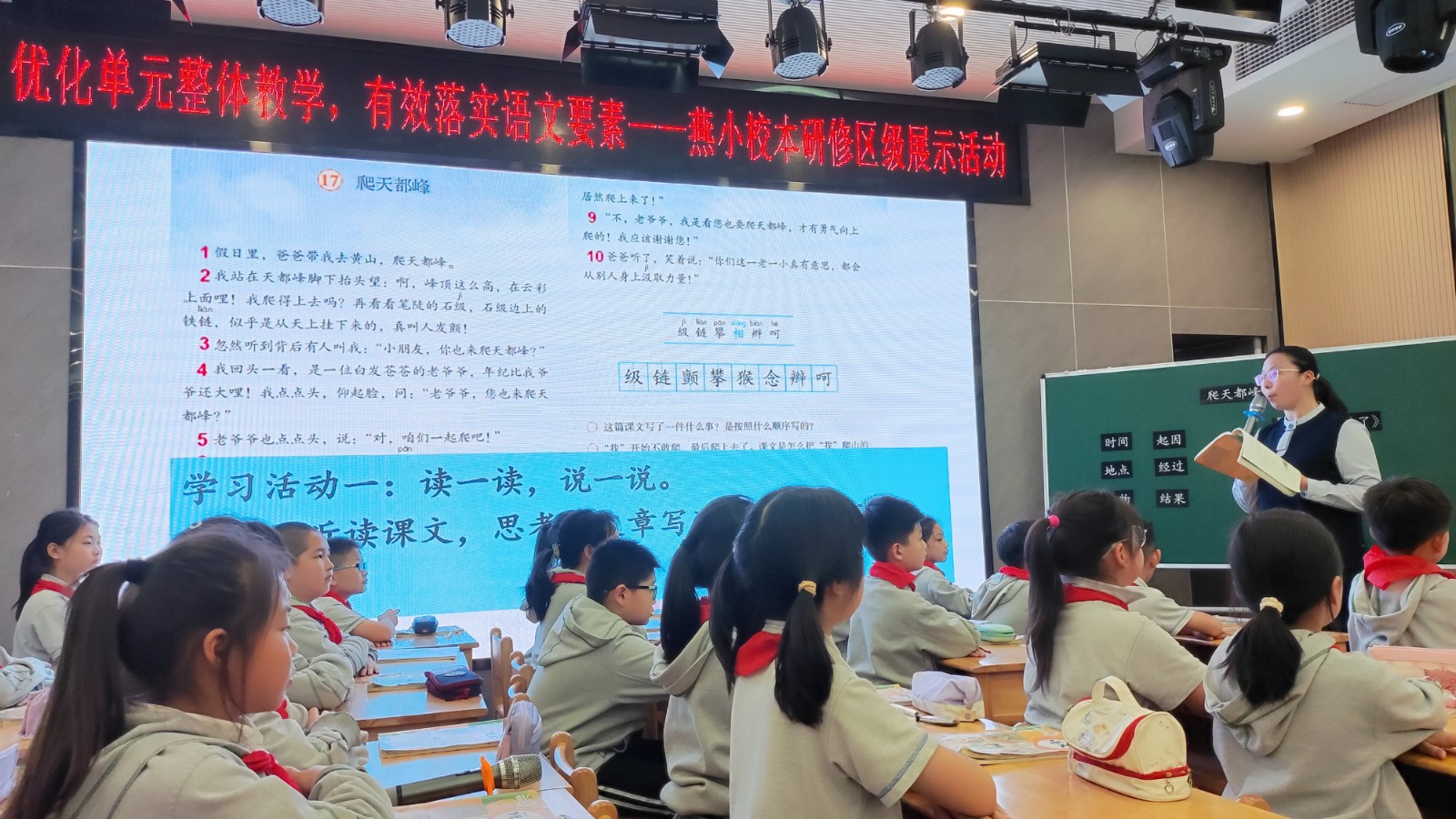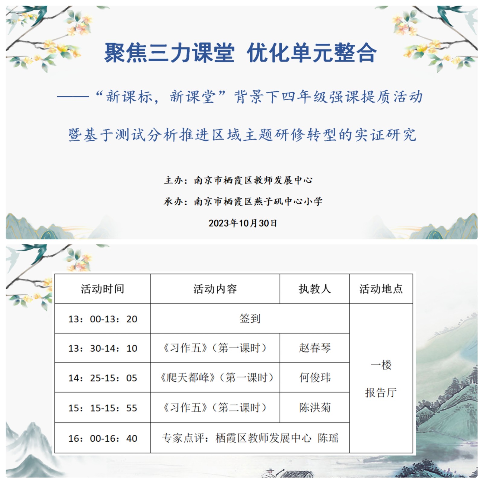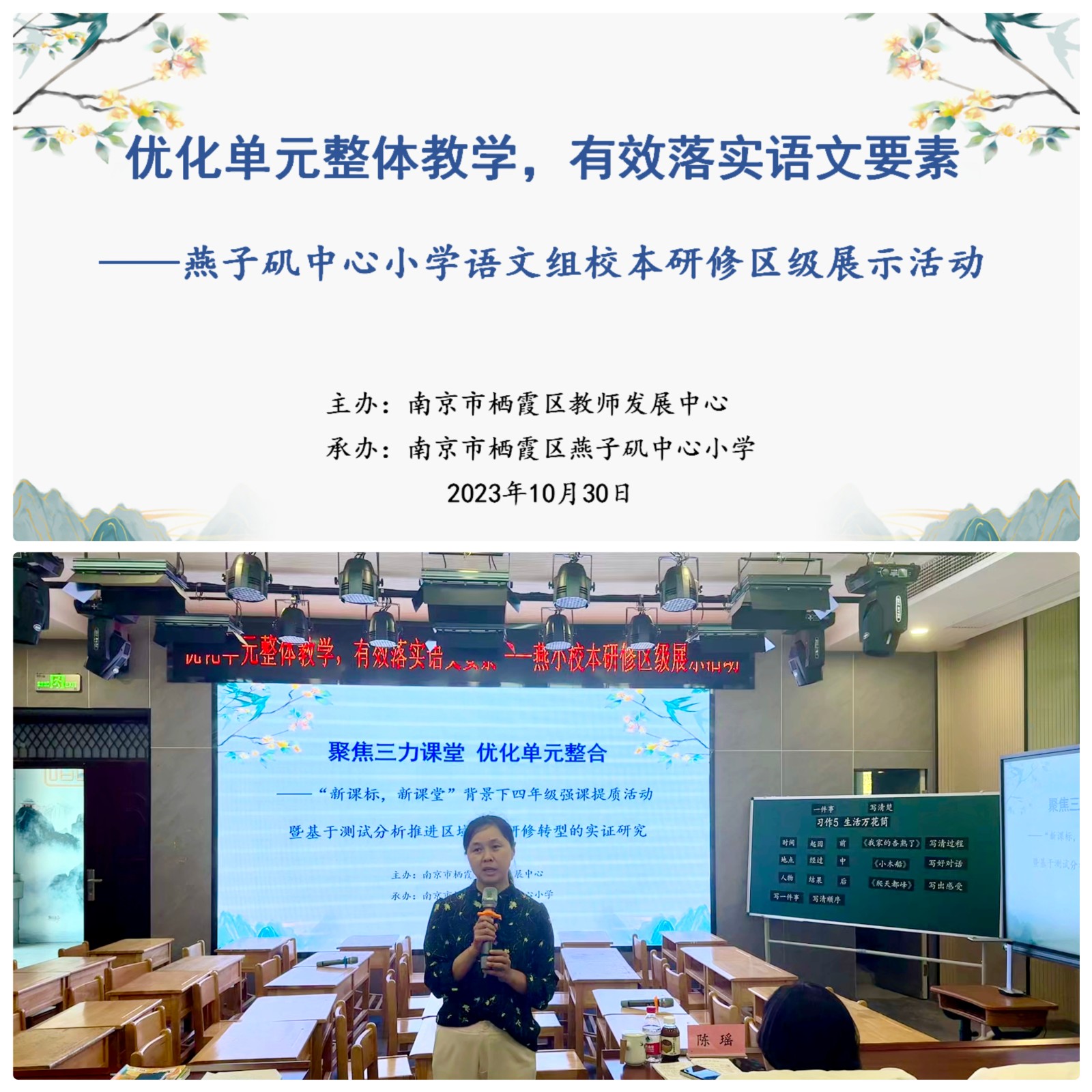 聚焦三力课堂,优化单元整合。10月30日下午,栖霞区主题为“‘新课标,新课堂’背景下四年级强课提质” 暨基于测试分析推进区域主题研修转型的实证研究活动,在燕子矶中心小学报告厅开展。本次活动由栖霞区教师发展中心小学语文研训员陈瑶老师策划指导,燕子矶中心小学郑玮校长、陈倩倩副校长,以及全区中片和西片的四年级语文教师共同参与研讨,教导处张晓春主任主持。