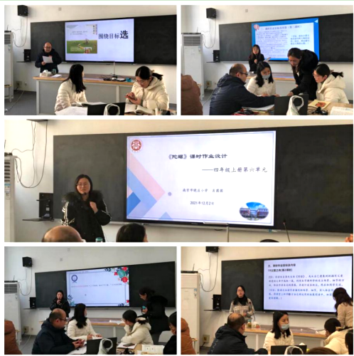 当天下午13:30,老师们分组入座后,周荣婷老师首先组织大家一起解读“单元课时作业”的板块设置,再次明确了作业设计指向单元四维目标的意识。