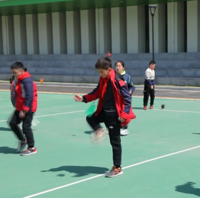 接下来进行的是踢毽子,好看的毽子在同学们的身前上下翻飞,像一只只翩翩起舞的蝴蝶。