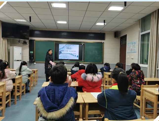 第一节课由张晓茵老师在录播教室为大家带来的诵读微课展示。张老师以“冬韵诗情”为题,选取与雪有关的10首古诗,学生通过读、品、析进行体会和感悟,配以丰富的图片展示雪的风采,最后再进行跟唱。形式多样,学生配合度高。