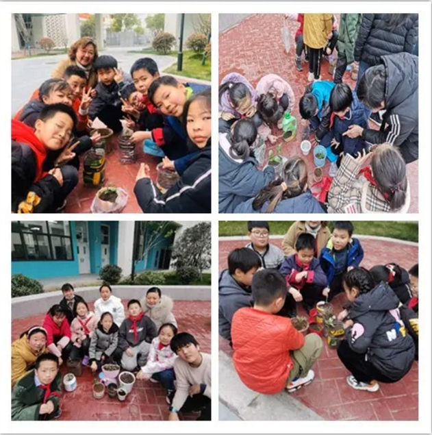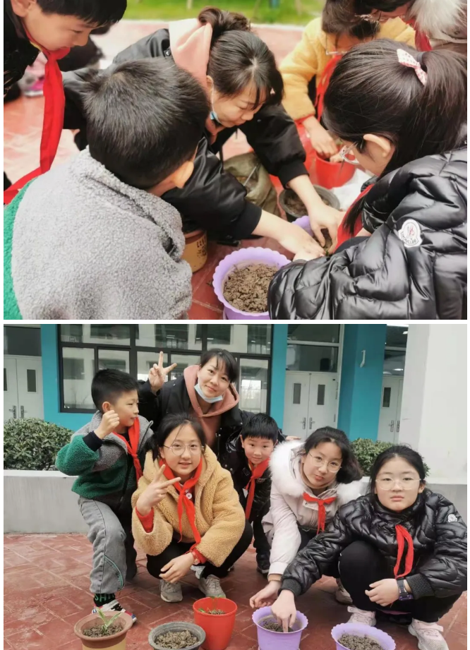 家长种植团的代表现场为同学们讲解幼芽栽种的方法及注意事项。同学们在老师、家长的带领下自由组合,分工合作,播下种子或幼芽、培土浇苗。一派人勤春来早的热闹景象在校园里徐徐展开。