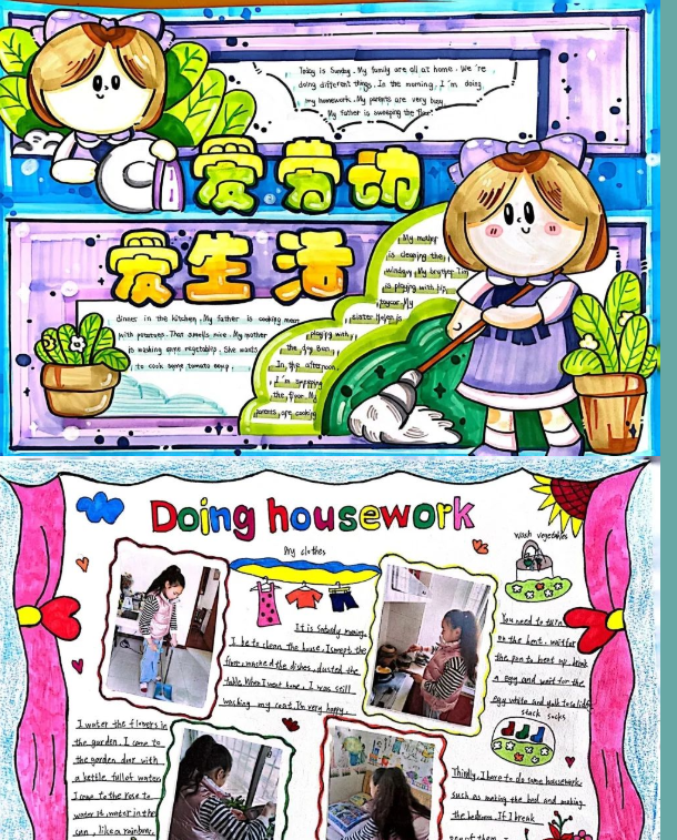 用英文小报绘劳动画卷,以国际眼光促品格提升。看着这一幅幅五彩缤纷的画卷,能够想象我们的孩子在平时学习生活中都是这样努力践行着自己的一言一行,也一定相信他们都是爱劳动的好少年!此次活动,不仅提升了学生学以致用的能力,更激发了学生的劳动热情,实现了学科与生活的融合。Enjoy labor, enjoy life!