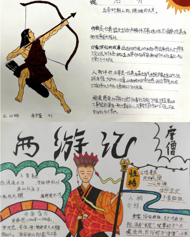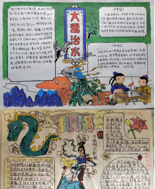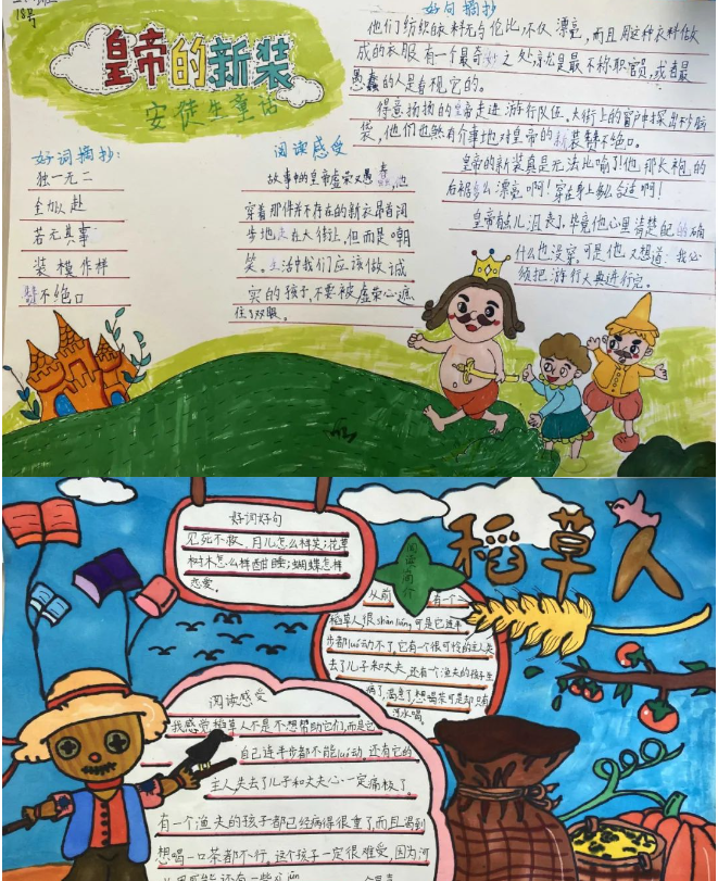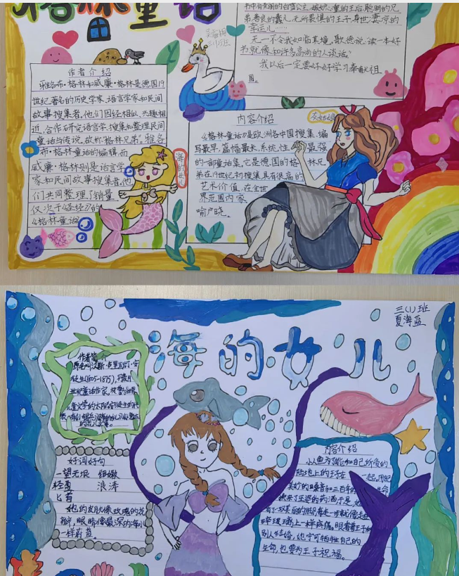 在第十七届读书节活动中,三年级同学们畅游童话王国。《安徒生童话》《格林童话》《稻草人》,这些有趣的童话故事,增长了同学们的阅读知识,也丰富了他们的情感体验!四年级同学们则从天马行空的神话故事中,汲取阅读的力量。让我们欣赏三、四年级同学们带来的小报作品,走进童话和神话的想象世界吧!